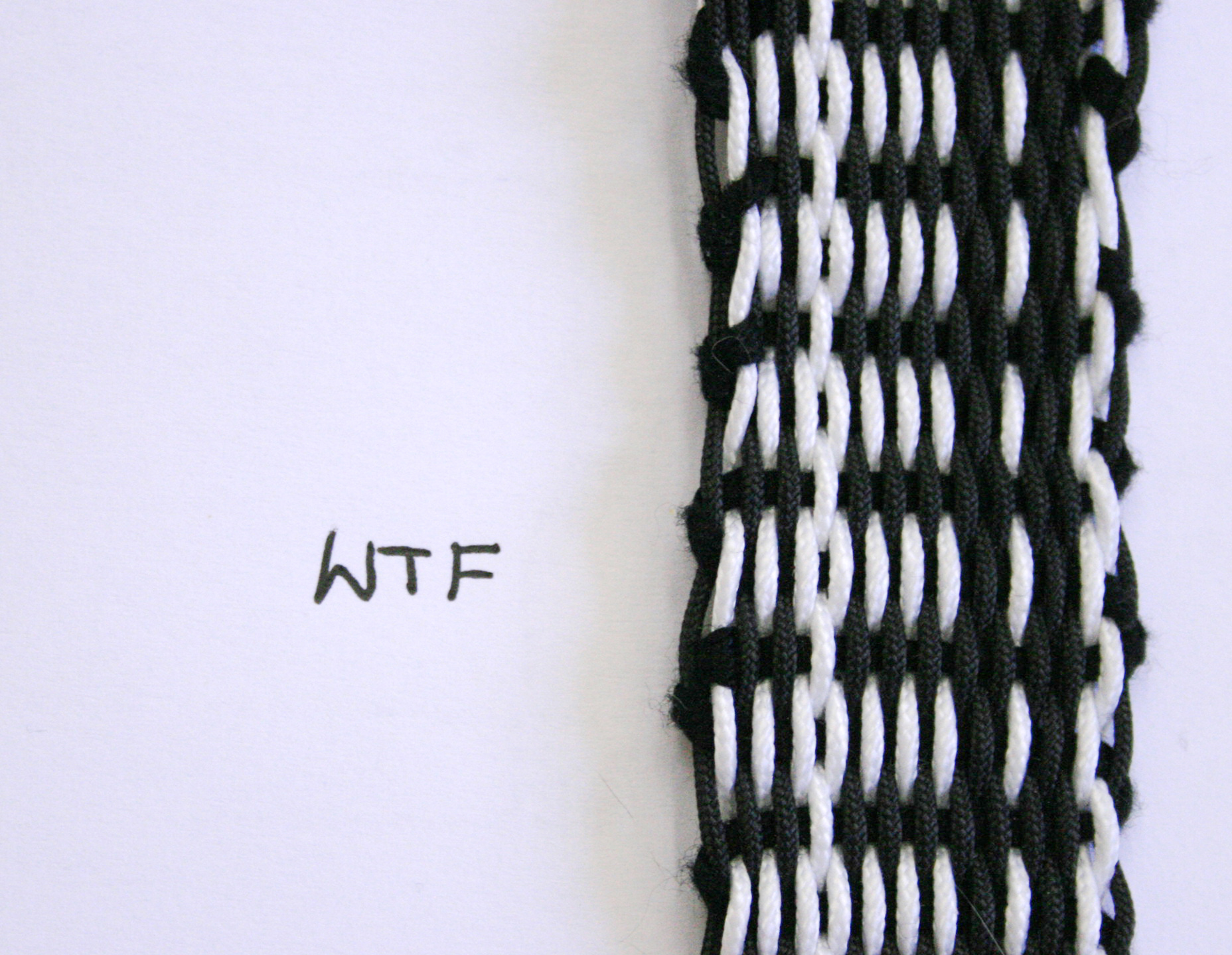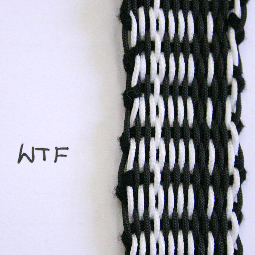URBAN MSG uses acronyms of online-slang as for example WTF, LOL or THX and transcribed them back into 8bit code. This coded message is woven in black and white strings into a band and brought back to the "real world" into transit zones, where these messages are often used in mobile communication.